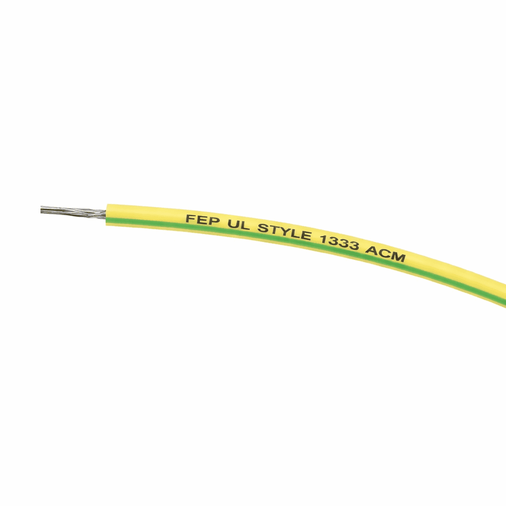 Cavi unipolari in FEP a conduttore flessibile in rame stagnato, isolato in fep colore giallo con singola o doppia riga verde coestrusa, a marchio UL AWM Style 1333 valido per USA e CANADA.