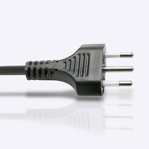 Spina tripolare con spinotto di terra centrale, collegata al cavo in modo indissolubile.